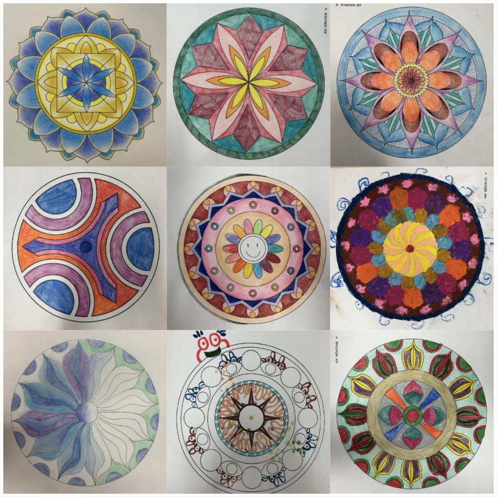 活动伊始,梁老师向同学们介绍曼陀罗绘画的含义、由来,以及曼陀罗绘画的作用。讲解完绘画活动步骤之后,伴随着舒缓的轻音乐和冥想放松指导语,同学们放松了身心,在曼陀罗绘画创作过程中体会自己的情绪,用颜色和图案表达自己的感受。绘画结束后,梁老师邀请了几位同学就自己的曼陀罗绘画作品,讲述自身经历和感受。曼陀罗创作过程是一次情景的再现和情感的再体会。每个人的曼陀罗图案都代表着不同的自我体验,持续创作时便会形成某种程度的内在转变,释放情绪,激活内在能量。