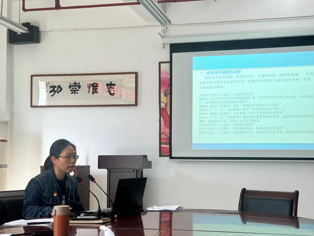 会议组织教职工观看视频《大道之行 海洋强国:海洋是高质量发展战略要地》。郑德华在领学中指出,习近平总书记关于建设海洋强国的重要论述,为扎实推进海洋强国建设提供了根本遵循,赋予了强大动力,为主动服务海洋强国建设指明了方向。她强调,公司要从两个方面主动服务海洋强国建设,一是要学深悟透习近平总书记关于建设海洋强国的重要论述精神,深刻领会建设海洋强国战略意义、实质内涵和根本路径,增强服务海洋强国建设的担当意识,要将中华海洋文明融入人才培养的全过程,教育引导老员工弘扬中华海洋文明,提升文化自信,增强经略海洋的使命感、责任感和自豪感。二是要进一步明确发力方向,提升服务海洋强国建设的能力水平。要在海洋强国建设的重大战略中找准自身定位,面向湾区,抓住机遇,发挥涉海类院校优势,促进学科交叉融合发展,推进产学研用深度融合。