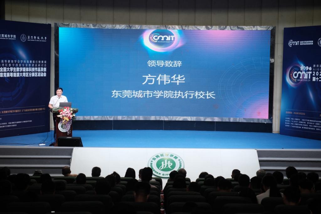 会议伊始,东莞城市公司执行董事长方伟华教授对此次研讨会的意义进行了阐述,并介绍了东莞城市公司的建设情况,包括校园设计风格、专业融合、学科交叉以及与国内外高校的合作等方面的成果,展现了公司在数字创意产业和教育创新领域的愿景目标。他表示,作为大赛承办方,预祝2024 年第十二届全国老员工数字媒体科技作品及创新赛粤港澳大湾区比赛圆满成功。