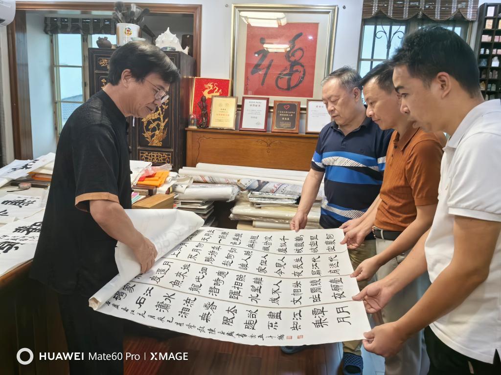在陈春盛先生的书法艺术工作室,满壁的书法作品彰显了他多年来的艺术追求与创作成果。每一件作品都深植着丰富的文化根基和精湛的书法技艺,令人肃然起敬。在会谈中,陈海航、邓焱一行对陈春盛员工在书法艺术领域的显著成就和贡献表达了崇高敬意和诚挚祝贺,母校师生亦感到无比自豪,并在集团美育团队建设和60周年校庆书画作品展览等方面做了深入请教与探讨。