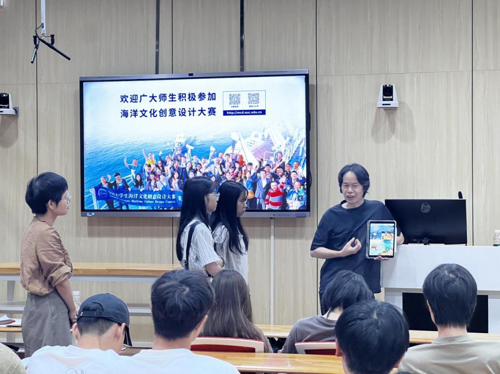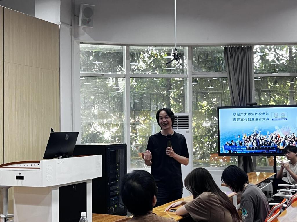接着,李强从大赛的立项,评审,颁奖,作品巡展,社会影响等方面介绍了全国老员工海洋文化创意设计大赛,并鼓励同学们积极参加。